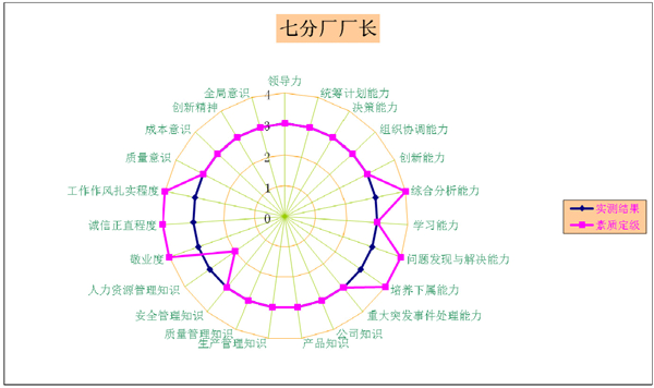 進(jìn)入到能力素質(zhì)測評階段,按照咨詢項目計劃,測評工作采用360度的測評方法。根據(jù)每個崗位所處的位置,抽取其上級、平級、下級進(jìn)行270度的全方位測評,測評過程中選取2名上級、3名平級、以及若干下級人員參與實際測評工作,權(quán)重以上級主管人員為主,平級同事為輔,下屬員工作為參考。咨詢項目組以最快的速度將測評表統(tǒng)計完畢,并形成每個人的能力素質(zhì)測評雷達(dá)圖。如圖例所示: