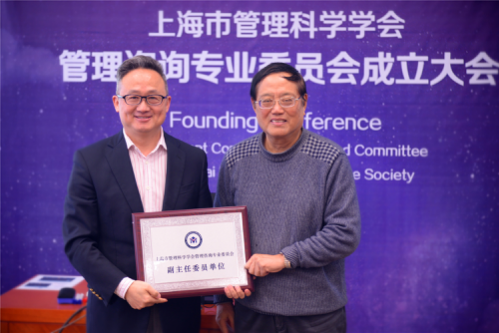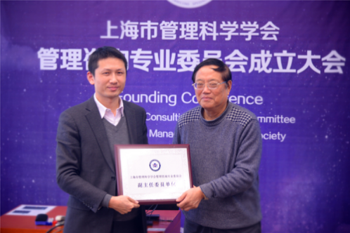 學(xué)會理事長王方華教授為副主任委員張偉華先生(百川會所總經(jīng)理)授牌