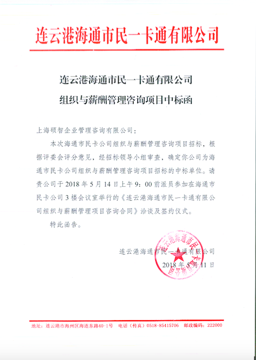 碩智咨詢憑借在組織與人力資源管理領(lǐng)域的專業(yè)度及落地務實的咨詢風格,成功簽約連云港海通市民一卡通有限公司。碩智咨詢提供專業(yè)的組織優(yōu)化設計、薪酬體系建設等管理落地咨詢服務,助力一卡通公司提升為民、務實、高效、便捷的民生服務功能,并助推一卡通公司實現(xiàn)多元化跨越式發(fā)展。