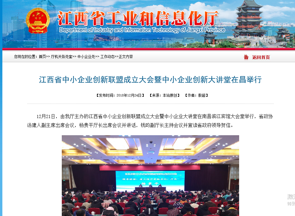 2018年12月21日,江西省工信廳在南昌舉行江西省中小企業(yè)創(chuàng)新聯(lián)盟成立大會,為省中小企業(yè)創(chuàng)新發(fā)展、轉(zhuǎn)型升級搭建新平臺。省政協(xié)、工信廳領(lǐng)導(dǎo)以及中國工程院院士倪光南出席;上海碩智當選為常務(wù)理事單位,公司創(chuàng)始合伙人黃楠應(yīng)邀參加成立大會。