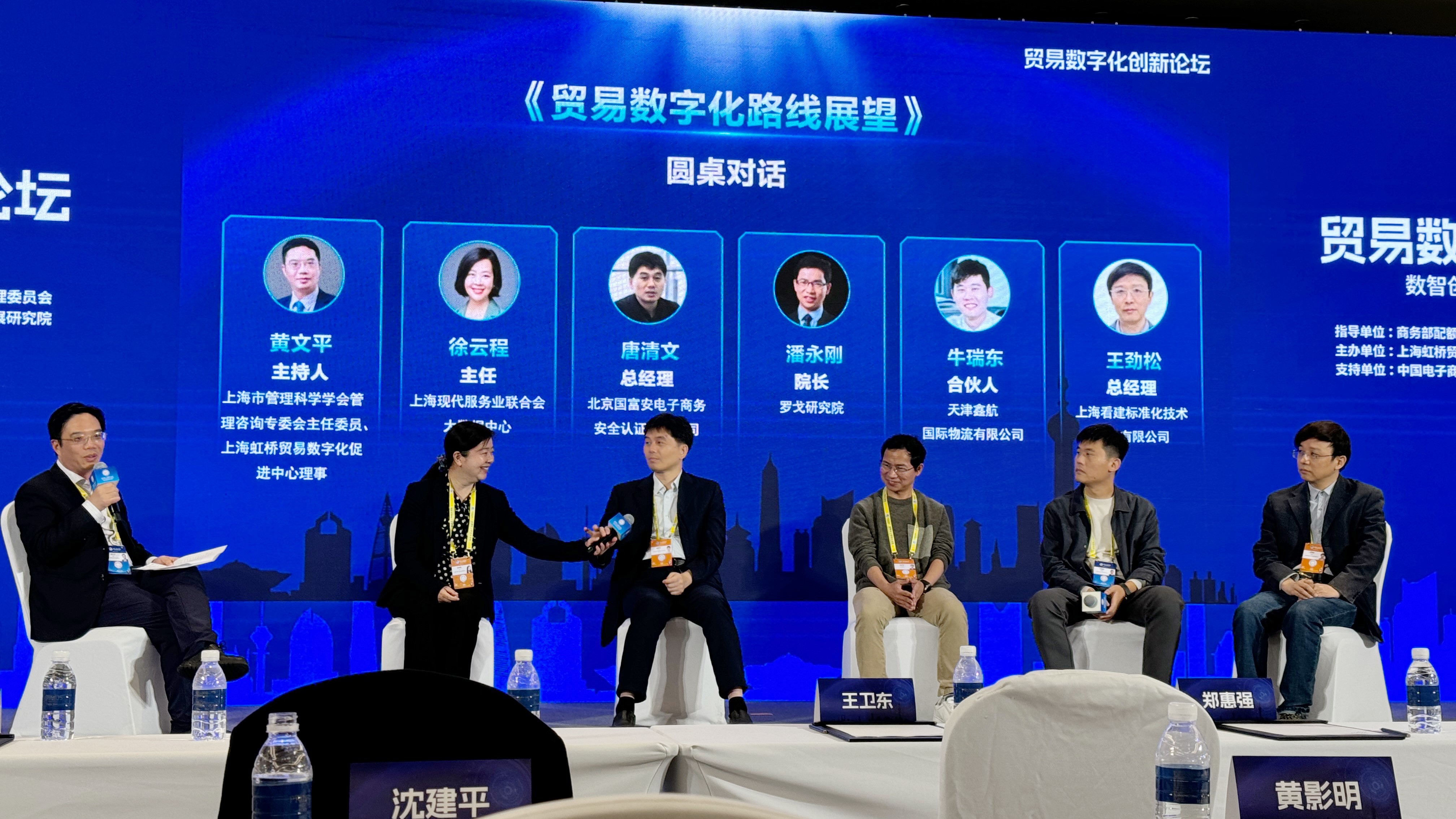 本次論壇活動的圓桌對話環(huán)節(jié),由上海市管理科學學會管理咨詢專委會主任委員、上海虹橋貿(mào)易數(shù)字化促進中心理事黃文平博士主持,邀請了上?,F(xiàn)代服務(wù)業(yè)聯(lián)合會大數(shù)據(jù)中心主任徐云程、北京國富安電子商務(wù)安全認證有限公司總經(jīng)理唐清文、羅戈研究院院長潘永剛、天津鑫航國際物流有限公司合伙人牛瑞東、上海看建標準化技術(shù)服務(wù)有限公司總經(jīng)理王勁松等五位嘉賓共同就“貿(mào)易數(shù)字化路線展望”這一主題進行了深入討論。