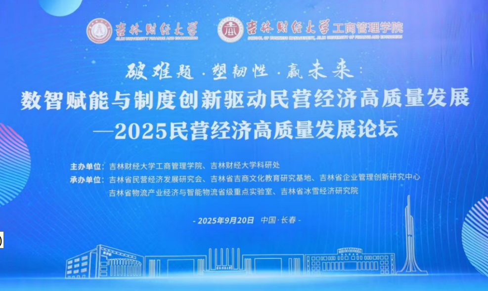 9 月 20 日,由吉林財(cái)經(jīng)大學(xué)工商管理學(xué)院、科研處主辦,吉林省民營(yíng)經(jīng)濟(jì)發(fā)展研究會(huì)、吉林省企業(yè)管理創(chuàng)新研究中心等單位承辦的 “2025 民營(yíng)經(jīng)濟(jì)高質(zhì)量發(fā)展論壇”,在吉林財(cái)經(jīng)大學(xué)報(bào)告廳順利召開。