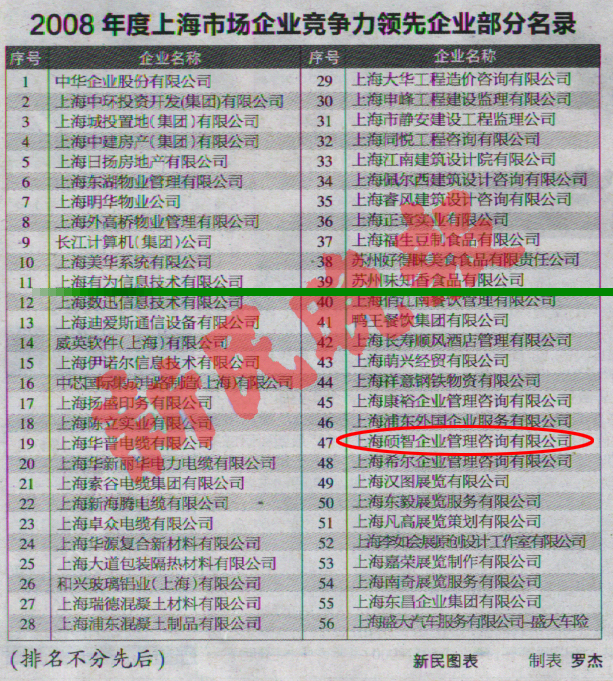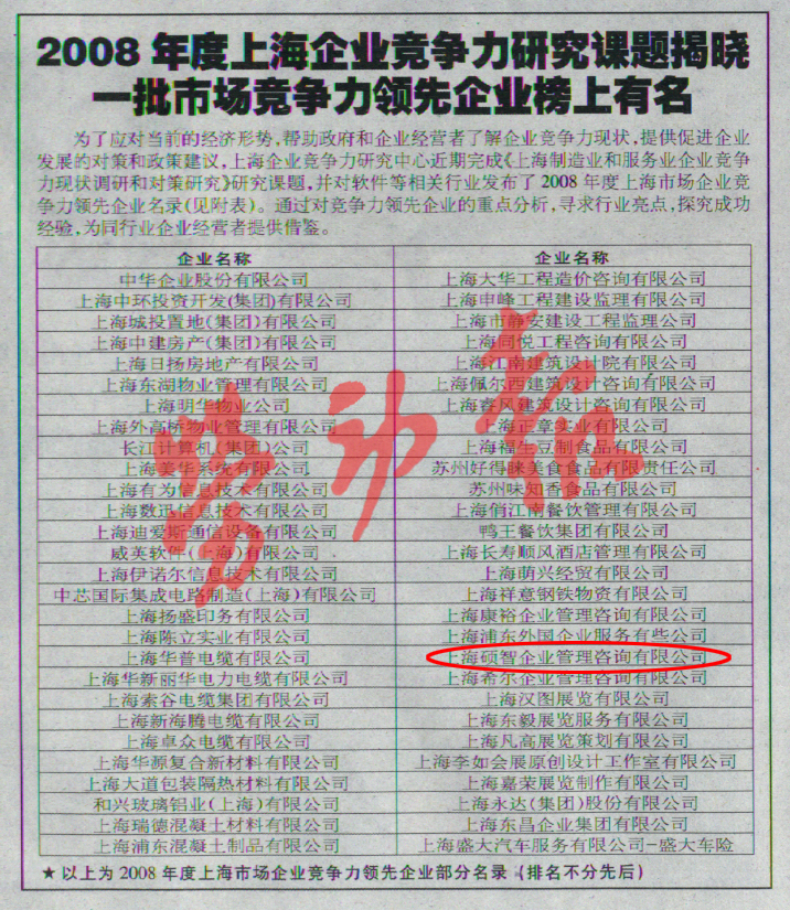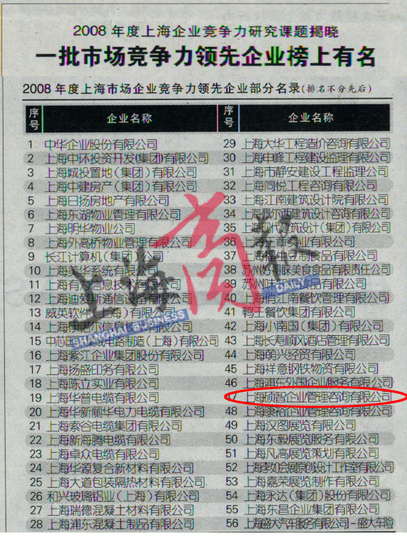 經(jīng)過市統(tǒng)計局、市經(jīng)濟信息委、市商務(wù)委指導(dǎo)和資料佐證,行業(yè)協(xié)會(商會)協(xié)助調(diào)研,且根據(jù)規(guī)模、市場、服務(wù)(產(chǎn)品)、管理、技術(shù)、文化、團隊、品牌、成長性、社會責(zé)任性等10項指對上海所有管理咨詢企業(yè)進行分析、評估。我公司被評入‘2008年度上海管理咨詢企業(yè)競爭力前50強’之行列。